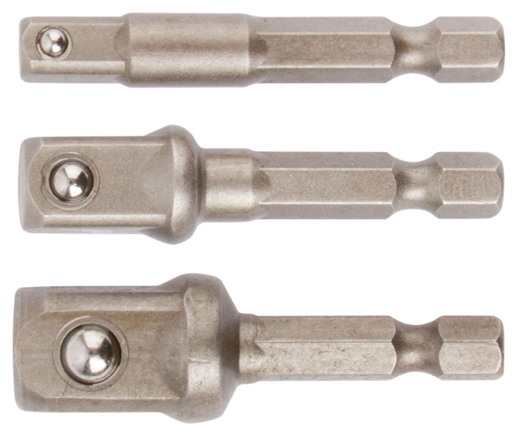 Для установки торцевых головок в отвертки для бит или патроны шуруповертов. В наборе 3 адаптера: 1/4", 3/8", 1/2". Материал: легированная сталь.
