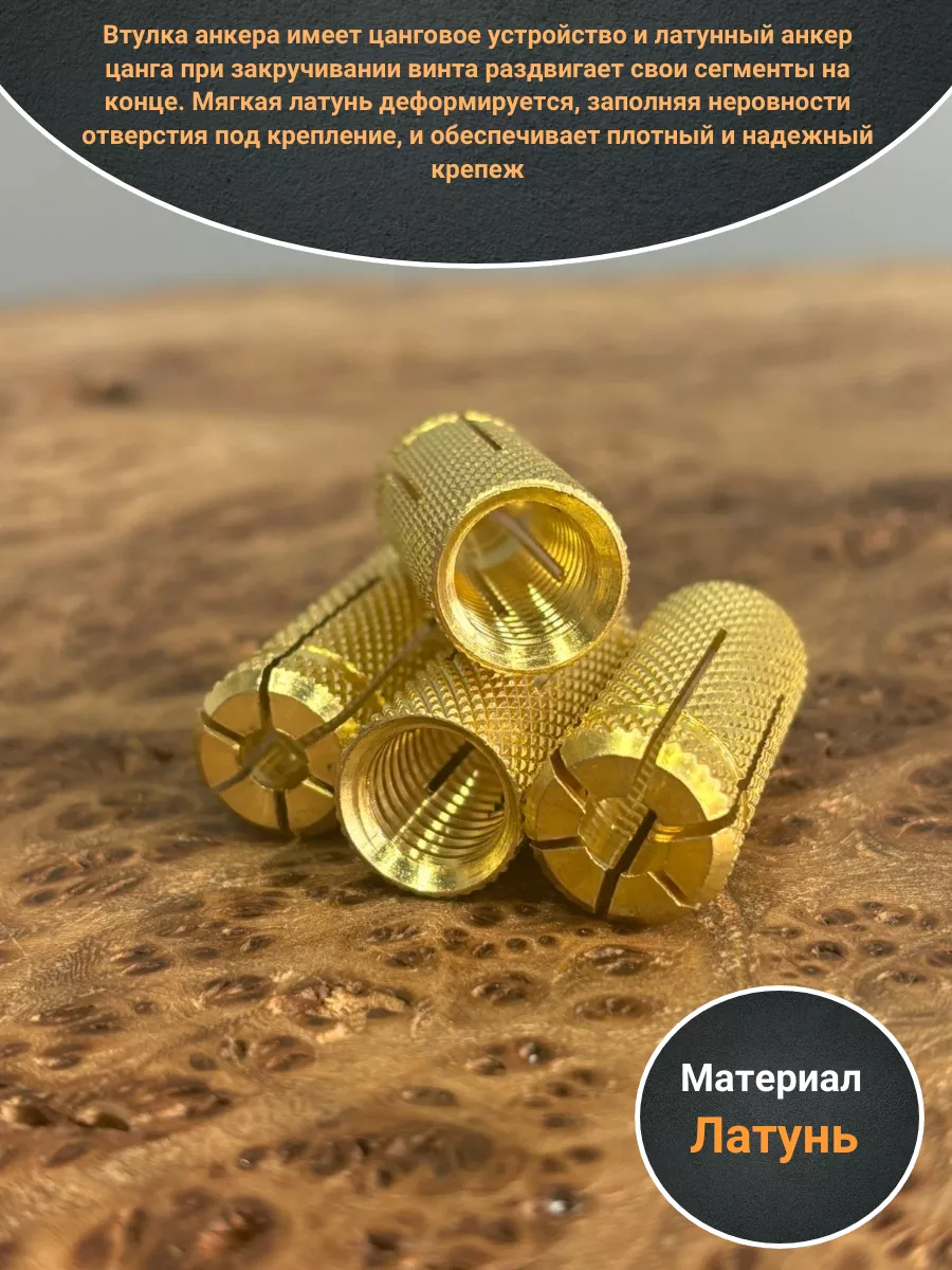 Латунные анкера предназначены для установки в стенах из прочных и твердых материалов. Крепление осуществляется винтом, который в комплект крепежа не входит. Ассортимент выпускаемых анкеров предусматривает использование винтов от М6 до М16. Втулка анкера имеет цанговое устройство и латунный анкер цанга при закручивании винта раздвигает свои сегменты на конце. Мягкая латунь деформируется, заполняя неровности отверстия под крепление, и обеспечивает плотный и надежный крепеж.