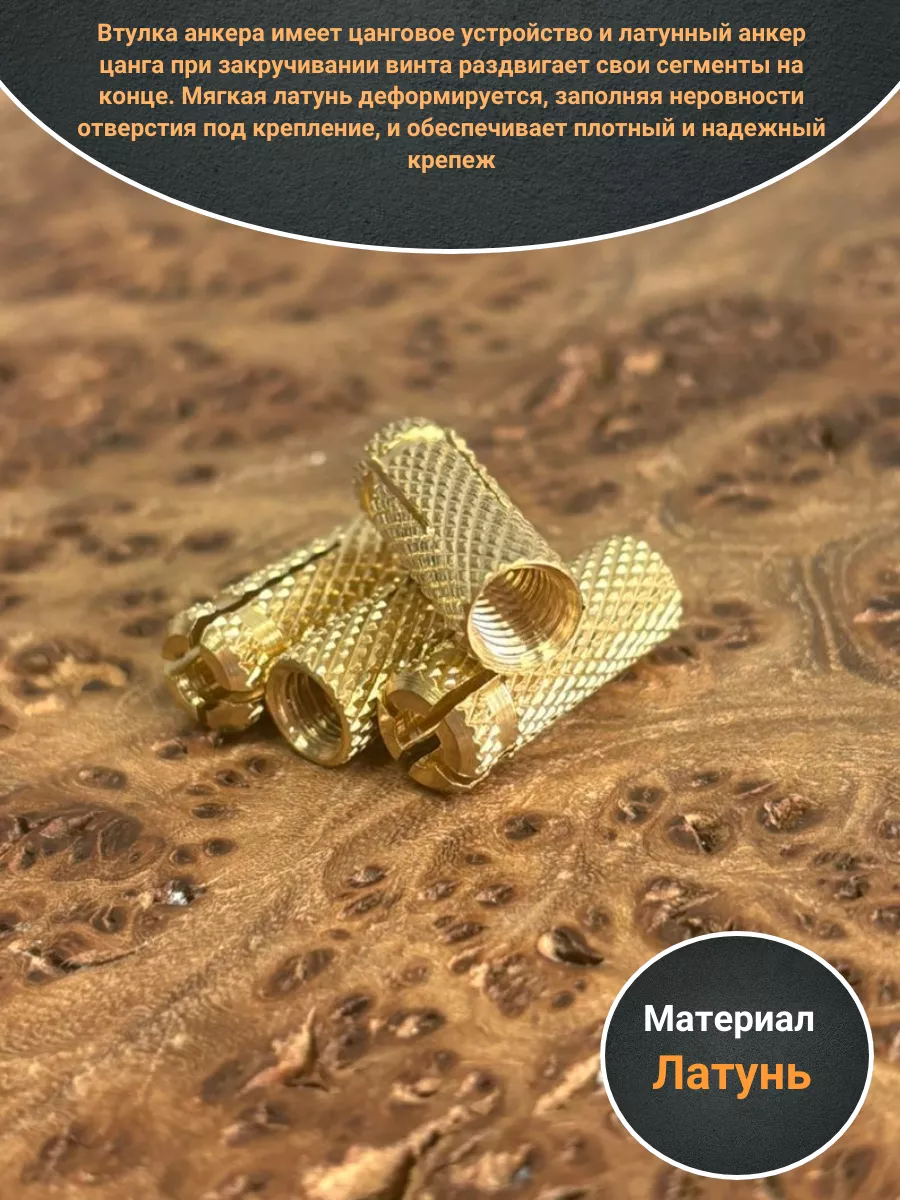 Латунные анкера предназначены для установки в стенах из прочных и твердых материалов. Крепление осуществляется винтом, который в комплект крепежа не входит. Ассортимент выпускаемых анкеров предусматривает использование винтов от М6 до М16. Втулка анкера имеет цанговое устройство и латунный анкер цанга при закручивании винта раздвигает свои сегменты на конце. Мягкая латунь деформируется, заполняя неровности отверстия под крепление, и обеспечивает плотный и надежный крепеж.