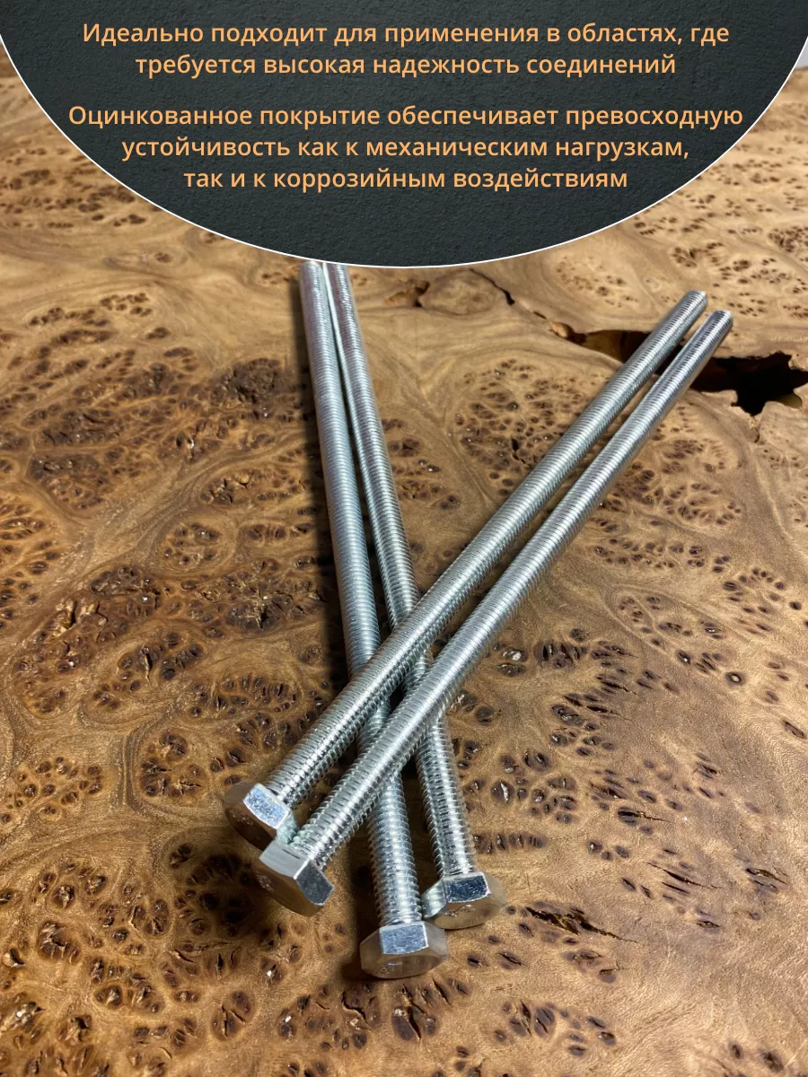 Болт с полной резьбой применяется в легких конструкциях либо, где действует нагрузка, направленная вдоль стержня крепежа. Болт устанавливается в одну конструкцию и фиксирует другую за счет плотно насаженной гайки. Полная резьба болта позволяет применять его при различных размерах скрепляемых элементов. Болт, класс прочности которого 8.8, 10.9 или 12.9 относится к высокопрочным изделиям. Болтовое соединение является очень надежным, что особенно важно при скреплении металлических конструкций. Имеет достаточный антикоррозионный защитный слой. Материал: Оцинкованная сталь 8.8