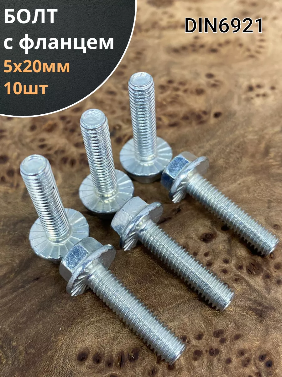Болт с шестигранной головкой и фланцем используют как крепление различных деталей или конструкций. Данный болт используют только вместе с шайбой или гайкой. Болт DIN 6921 изготавливают из оцинкованной стали. Модель имеет как резьбу на 4/5 длине стержня, так и полную резьбу, а так же плоский фланец и шестигранную головку. Данная модель пользуется популярностью на строительно-монтажных площадках, установка болта не требует использование отдельной шайбы