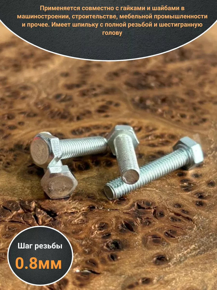 Применяется совместно с гайками и шайбами в машиностроении, строительстве, мебельной промышленности и прочее. Имеет шпильку с полной резьбой и шестигранную голову. Длина болта определяется по длине шпильке. Стандартный класс прочности для болтов от 4,8 до 5,8. Самый распространенный вид болтов применяется совместно с гайками и шайбами. Материал основания: Металл, дерево