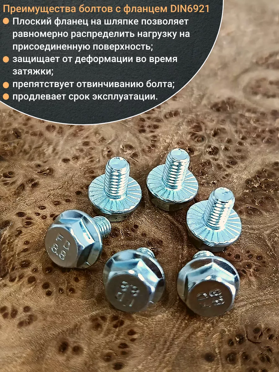 Болт с шестигранной головкой и фланцем используют как крепление различных деталей или конструкций. Данный болт используют только вместе с шайбой или гайкой. Болт DIN 6921 изготавливают из оцинкованной стали. Модель имеет как резьбу на 4/5 длине стержня, так и полную резьбу, а так же плоский фланец и шестигранную головку. Данная модель пользуется популярностью на строительно-монтажных площадках, установка болта не требует использование отдельной шайбы