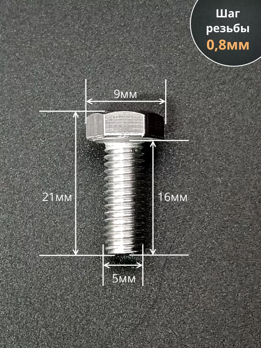 Материалом для болта служит нержавеющая сталь класса A2. У изделия есть цилиндрический стержень c полной резьбой М5 и шестигранная головка. Шляпка передает крутящий момент от ключа к крепежу при завинчивании. Для создания прочных резьбовых соединений крепеж используется в комбинации с шайбой и гайкой или завинчивается в отверстия с нарезанной резьбой. Чтобы исключить электрохимическую коррозию, шайбы с гайкой делаются из коррозионно-устойчивой стали либо нейтральных полимерных материалов.