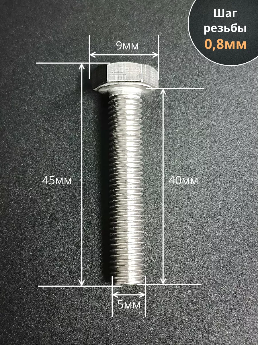 Материалом для болта служит нержавеющая сталь класса A2. У изделия есть цилиндрический стержень c полной резьбой М5 и шестигранная головка. Шляпка передает крутящий момент от ключа к крепежу при завинчивании. Для создания прочных резьбовых соединений крепеж используется в комбинации с шайбой и гайкой или завинчивается в отверстия с нарезанной резьбой. Чтобы исключить электрохимическую коррозию, шайбы с гайкой делаются из коррозионно-устойчивой стали либо нейтральных полимерных материалов.