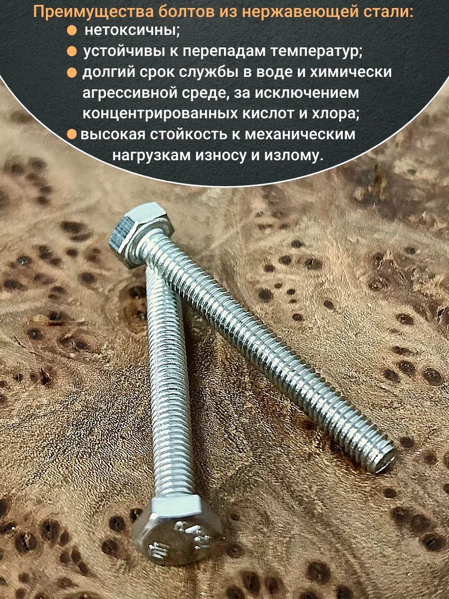 Нержавеющая сталь данной марки повышает прочность болта, который выдерживает динамические усилия и вибрацию. Изделие монтируют в помещениях и вне их. Крепеж имеет практически неограниченный ресурс работы, на который не влияет воздействие воды и изменений температуры воздуха.