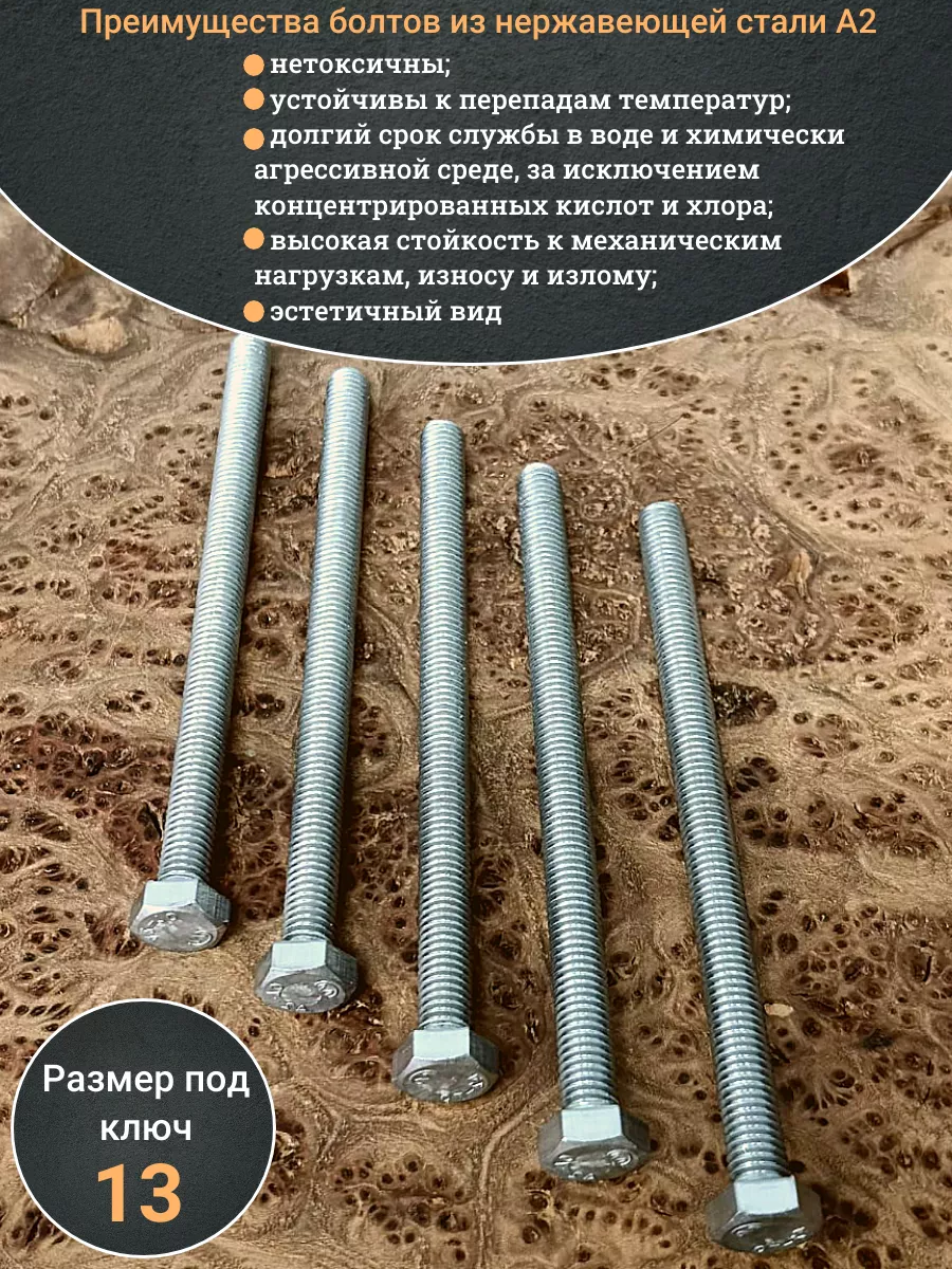 Материалом для болта служит нержавеющая сталь класса A2. У изделия есть цилиндрический стержень c полной резьбой и шестигранная головка. Шляпка передает крутящий момент от ключа к крепежу при завинчивании. Для создания прочных резьбовых соединений крепеж используется в комбинации с шайбой и гайкой или завинчивается в отверстия с нарезанной резьбой. Чтобы исключить электрохимическую коррозию, шайбы с гайкой делаются из коррозионно-устойчивой стали либо нейтральных полимерных материалов.