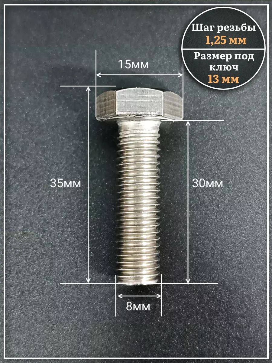 Материалом для болта служит нержавеющая сталь класса A2. У изделия есть цилиндрический стержень c полной резьбой М8 и шестигранная головка. Шляпка передает крутящий момент от ключа к крепежу при завинчивании. Для создания прочных резьбовых соединений крепеж используется в комбинации с шайбой и гайкой или завинчивается в отверстия с нарезанной резьбой. Чтобы исключить электрохимическую коррозию, шайбы с гайкой делаются из коррозионно-устойчивой стали либо нейтральных полимерных материалов.