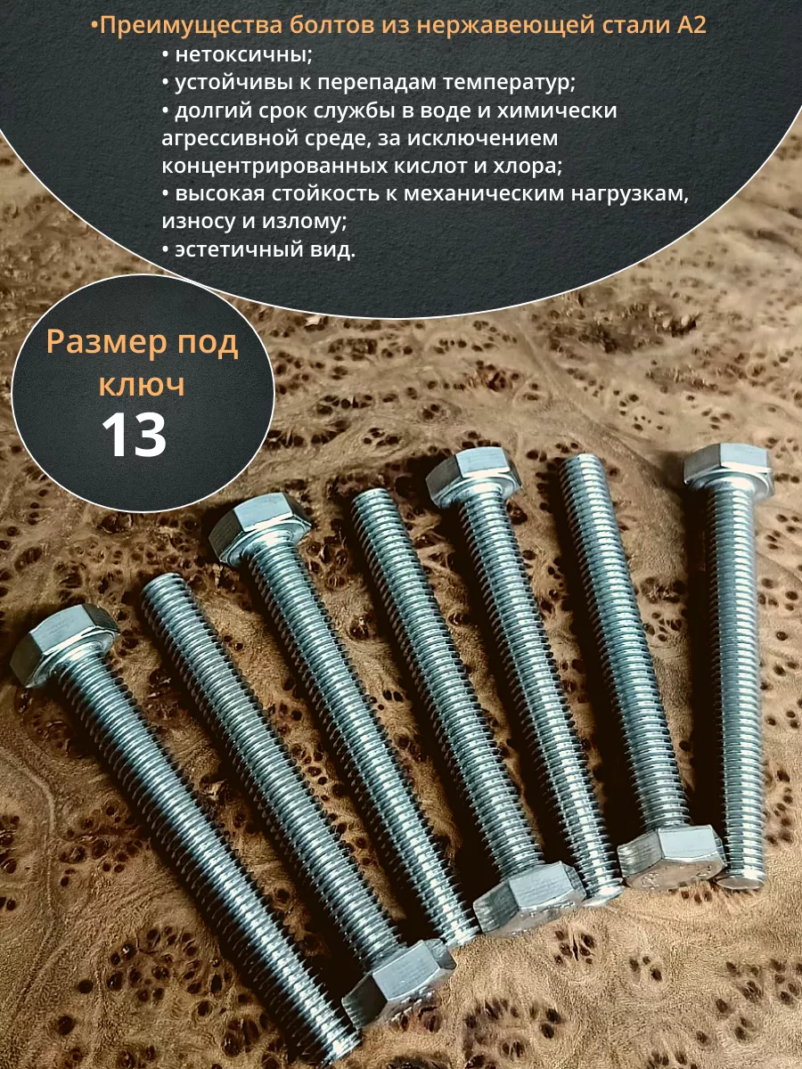Материалом для болта служит нержавеющая сталь класса A2. У изделия есть цилиндрический стержень c полной резьбой М8 и шестигранная головка. Шляпка передает крутящий момент от ключа к крепежу при завинчивании. Для создания прочных резьбовых соединений крепеж используется в комбинации с шайбой и гайкой или завинчивается в отверстия с нарезанной резьбой. Чтобы исключить электрохимическую коррозию, шайбы с гайкой делаются из коррозионно-устойчивой стали либо нейтральных полимерных материалов.