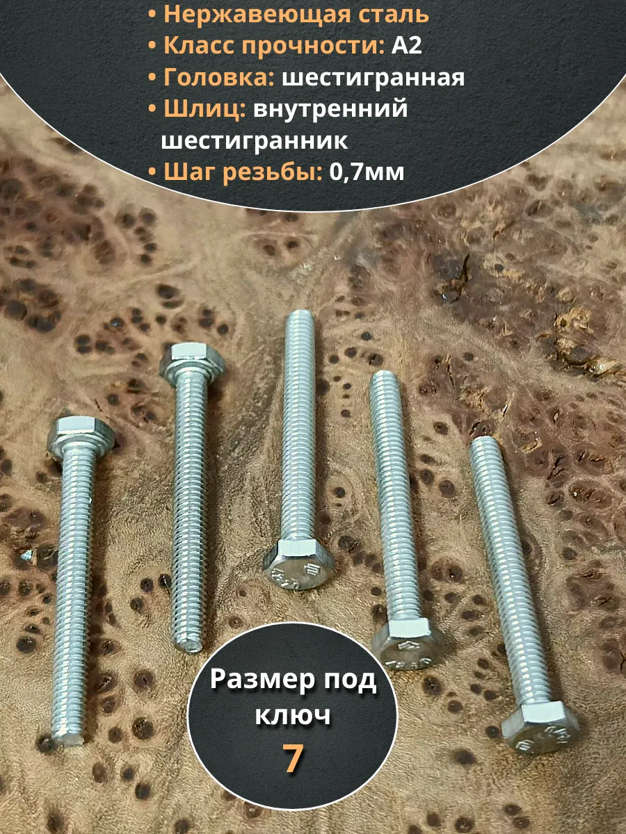 Материалом для болта служит нержавеющая сталь класса A2. У изделия есть цилиндрический стержень c полной резьбой и шестигранная головка. Шляпка передает крутящий момент от ключа к крепежу при завинчивании. Для создания прочных резьбовых соединений крепеж используется в комбинации с шайбой и гайкой или завинчивается в отверстия с нарезанной резьбой. Чтобы исключить электрохимическую коррозию, шайбы с гайкой делаются из коррозионно-устойчивой стали либо нейтральных полимерных материалов.