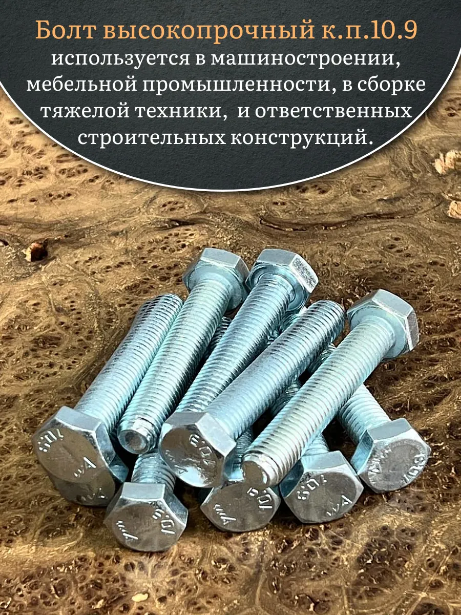Болт высокопрочный оцинкованный DIN 933 класса прочности 10.9 изготовлен из закаленной и отпущенной углеродистой стали, ударной вязкостью не ниже 49 Дж/см². Временное сопротивление разрыву - 1000 Н/мм², предел текучести - 900 Н/мм², то есть он примерно на 25 % прочнее метиза 8.8 класса. В ходе эксплуатации он выдерживает серьезные нагрузки статического и динамического характера, перепады температур, а также воздействие атмосферных факторов и влаги. Однородное и устойчивое к истиранию цинковое покрытие придает серебристый цвет и надежно в течение долгого срока эксплуатации защищает сталь от коррозии в слабоагрессивных условиях окружающей среды. Применяется в тяжелом машиностроении, при сборке технологического оборудования, станков и металлоконструкций различного назначения. Его часто используют для скрепления нескольких тонких деталей с последовательной фиксацией каждой при помощи гайки. Он подходит для совместной работы с забивными анкерами для крепления элементов к бетону и камню.