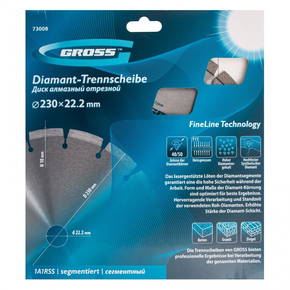 Алмазный диск Gross ф230 х 22,2 мм 73008 с лазерной приваркой сегментов предназначен для сухого резания бетона, в том числе свежего, кирпича, песчаника и гранита. Посадочный диаметр 22,2 мм позволяет использовать диск в качестве расходного инструмента для УШМ. Сегменты обеспечивают быстрое сухое резание без необходимости водяного охлаждения. За счет оптимально подобранной связки диск выдерживает перегрузки и подходит как для интенсивного бытового, так и для профессионального применения, когда требуется выполнить большой объем работ.