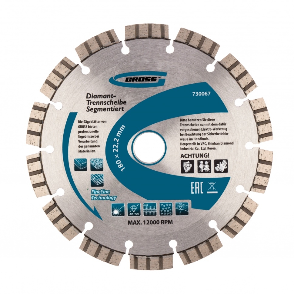Диск алмазный лазерная приварка турбо-сегментов сухое резание 180х22,2 мм Gross