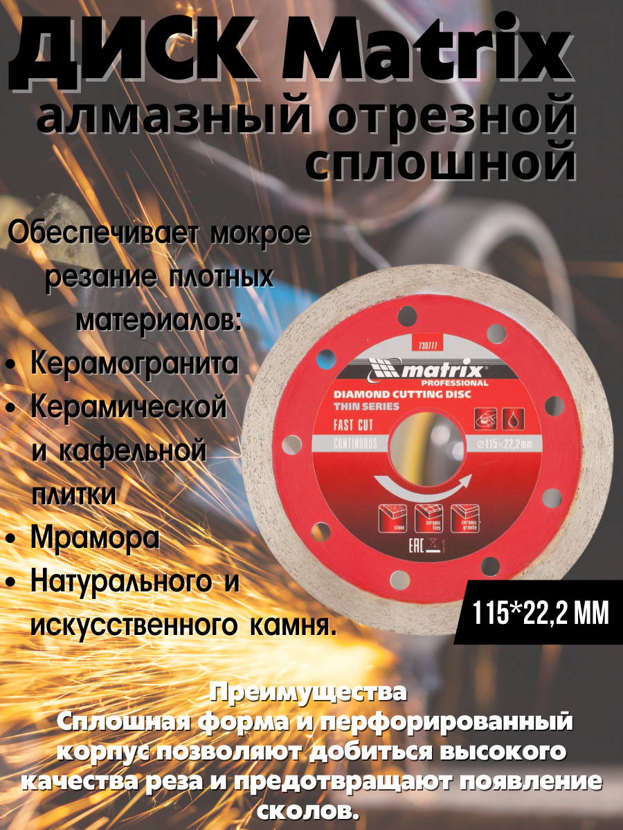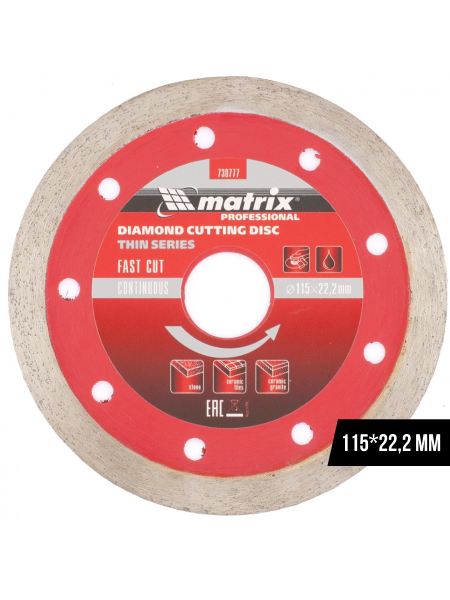 Диск отрезной алмазный сплошной тонкий сухое резание 115х22,2 мм Matrix