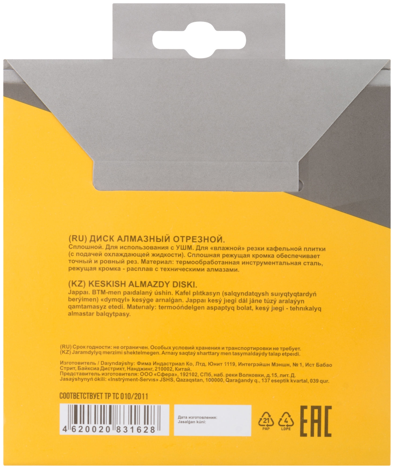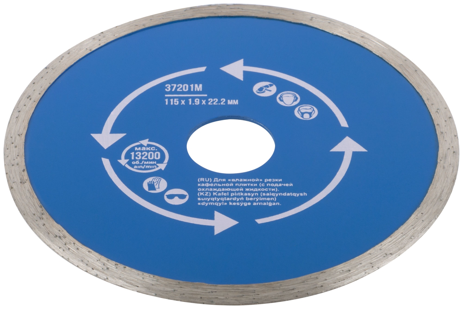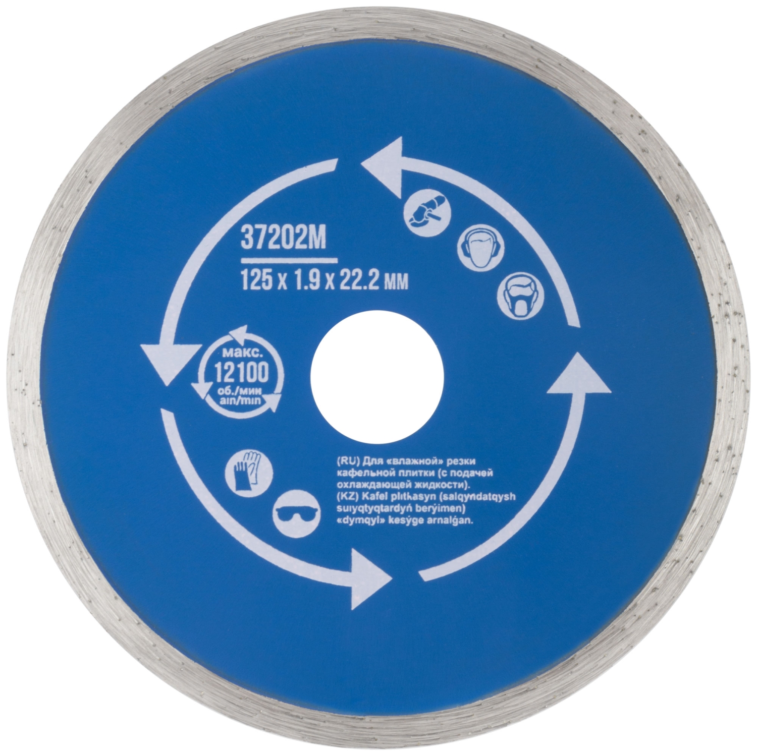 Сплошной. Для использования с УШМ. Посадочный диаметр 22,2 мм. Для "влажной" резки кафельной плитки (с подачей охлаждающей жидкости).<br/>Сплошная алмазная режущая кромка, высотой 5 мм, обеспечивает точный и ровный рез. Материал: инструментальная сталь, режущая кромка - расплав<br/>с техническими алмазами. Упаковка: блистер.