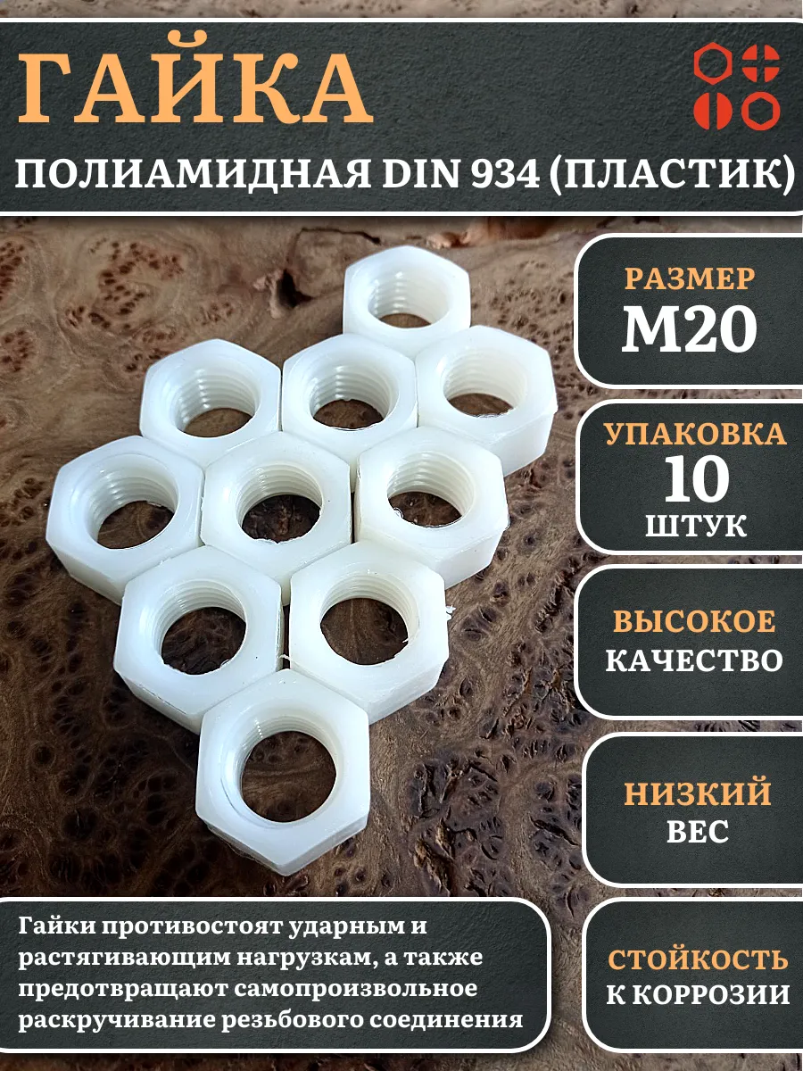 | Гайка полиамидная М20 DIN934 (пластик), 20 шт. | 2000000644196ф20 | 1 шт. |