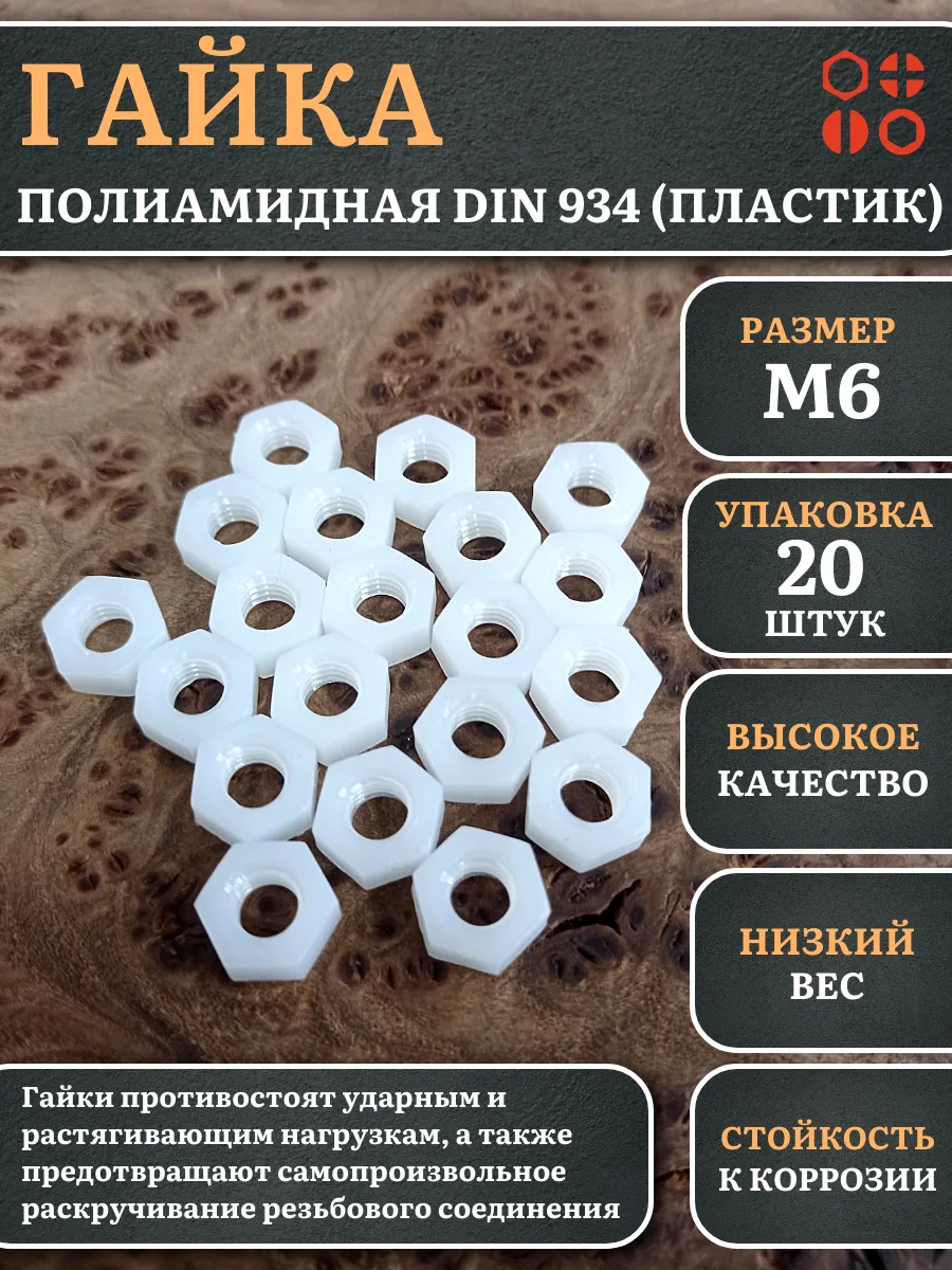 Гайка полиамидная М6 DIN934 (пластик), 20 шт.