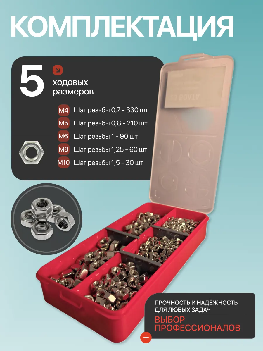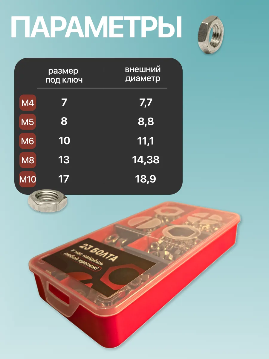 Гайки нержавеющие DIN934 М4,5,6,8,10 органайзер НАБОР 1