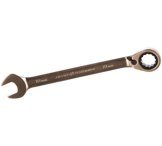 Комбинированный трещоточный ключ с переключателем 18 мм Дело Техники ДТ 100/5 515218 служит для монтажа или демонтажа крепежа, например, при ремонте автомобиля. Корпус, выполненный из хромванадиевой стали, отличается повышенной прочностью. Ключ состоит из рожковой головки и трещоточного механизма с переключателем - работает либо на закручивание, либо на откручивание. Накидная часть имеет изгиб под углом 10°.