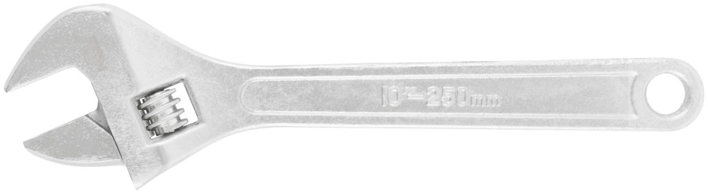 Ключ разводной 250 мм ( 30 мм ). Полированные губки с размерной шкалой. Материал: штампованная термообработанная инструментальная сталь с хромированным покрытием. Упаковка: пластиковый подвес.