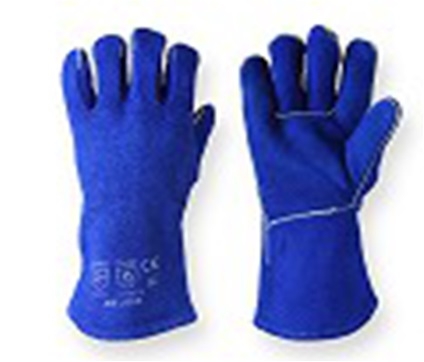 Подкладка плотная, 100% хлопковая ткань. Дополнительный термоизолирующий слой флиса на тыльной, ладонной части и пальцах. Усиление швов спилковыми вставками и прошиты огнеупорной нитью KEVLAR. Длина краги 35-37 см. Цвет спилка синий.Краги из спилка КРС сорта АВ, пятипалые.