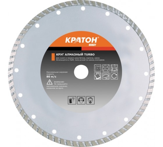 Круг алмазный TURBO HOBBY Кратон 1 08 03 007 предназначен для сухого и мокрого реза бетона, кирпича, камня. Имеет турбированную рабочую поверхность, что обеспечивает высокую производительность. Для резки бетона, кирпича, керамики, гранита, камня, мрамора.