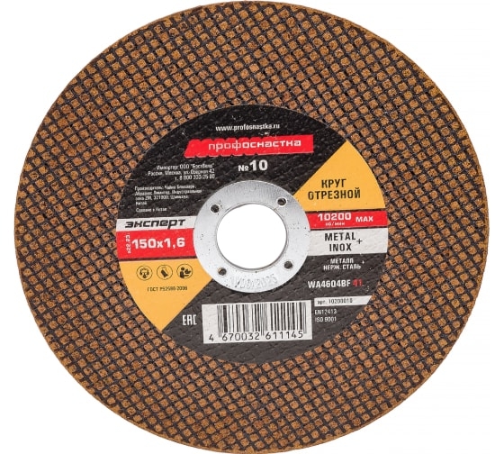 Отрезной круг №10 150*1,6*22 мм тип 41 ТМ Профоснастка предназначен для использования на УШМ. Обеспечивает мягкий рез и имеет высокий коэффициент шлифования (более 1,8) – показатель долговечности ресурса резания. Так же, с учетом цены отрезного диска и его ресурса, низкий показатель стоимости одного реза является наиболее выгодным для сравнения при интенсивном или индустриальном применении. Рекомендуется для резания углеродистых и нержавеющих сталей.