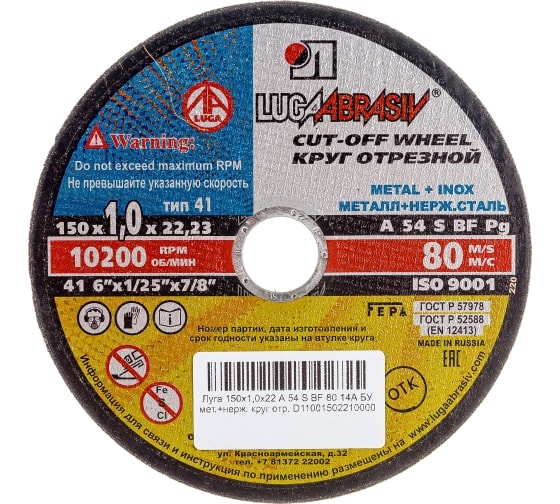 | Круг отрезной мет+нерж 150х1,0х22 мм A 54 S BF 80 Луга | D11001502210000 | 1 шт. |