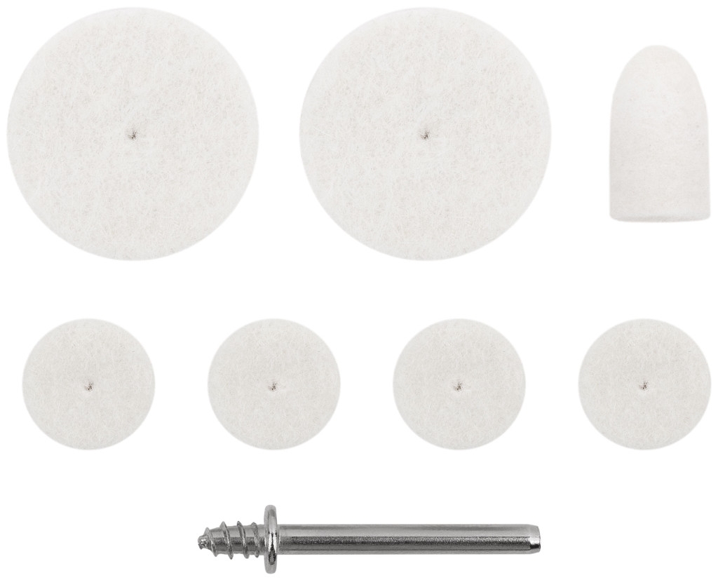 Для гравировальной машины. В наборе 8 шт. Для полировки поверхностей металлов, стекла, камня. D штифта=3,1 мм. Материал: хвостовик из=инструментальной стали. Упаковка: блистер.