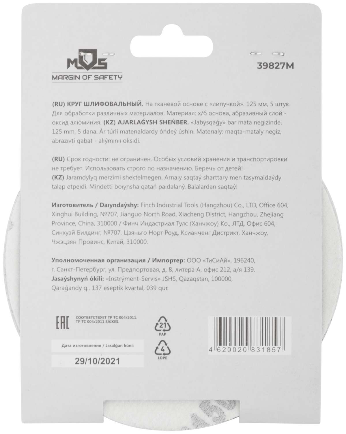 На тканевой основе с "липучкой". Диаметр 125мм, набор 5 шт. Для обработки различных метериалов. Материал: х/б основа, образивный слой-оксид алюминия