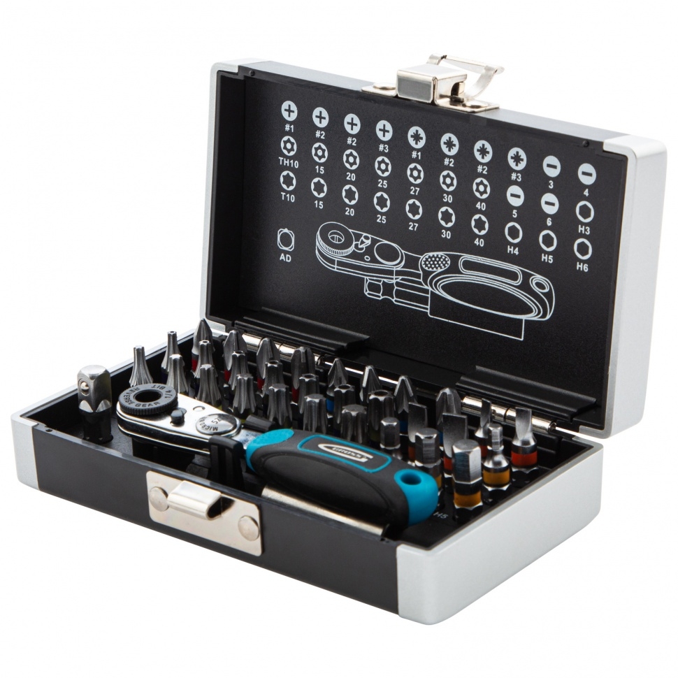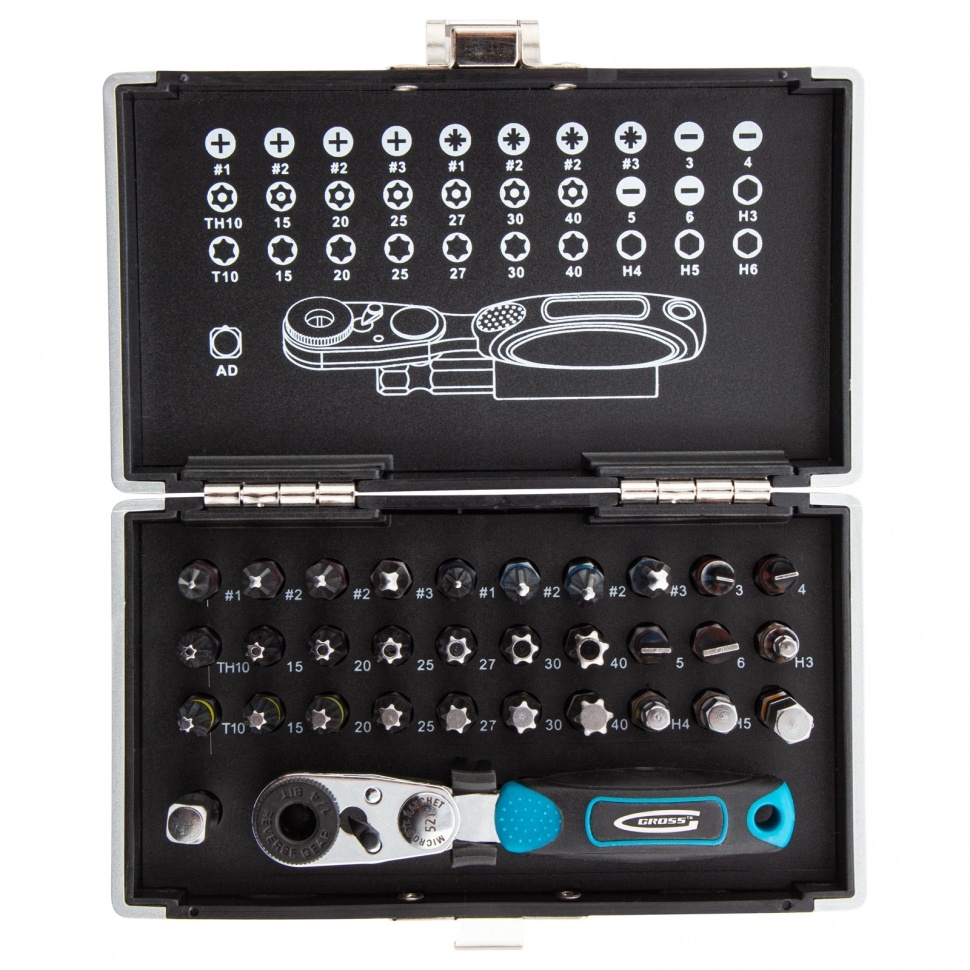 Набор бит 1/4" с магнитным держателем Gross 11365 предназначен для сборки мебели, велосипедов, бытовых приборов, технического обслуживания автомобилей и прочих монтажных, строительных и слесарных работ. В комплекте подобраны 30 бит самых ходовых типоразмеров, компактный ключ-трещотка с 52 зубьями, магнитный адаптер для бит, а также переходник для использования торцевых головок. Набор включает крестовые биты Филипс калибров 1-3, PZ 1-3, прямой шлиц 3-6, TORX и TORX Tamper 10, 15, 20, 25, 27, 30, 40, HEX 3-6.Высокопрочные биты из японской легированной стали S2 обладают повышенной износостойкостью и долгим сроком службы.Переходник оснащен шариком-фиксатором, который обеспечивает надежное крепление торцевой головки при работе. Адаптер для бит с магнитом гарантирует эффективную работу даже в труднодоступных местах без риска выпадения бит.Функция реверса в трещотке позволяет не только монтировать, но и демонтировать резьбовые соединения. Двухкомпонентная рукоятка трещотки удобно ложится в руку.