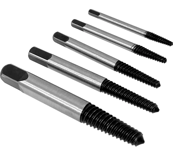 В комплекте 5 экстракторов типовых размеров для винтов с резьбой М3-6, М6-8, М8-11, М11-14, М14-18. Они изготовлены из хромомолибденовой стали высокого качества, благодаря чему отличаются прочностью и долгим сроком службы.