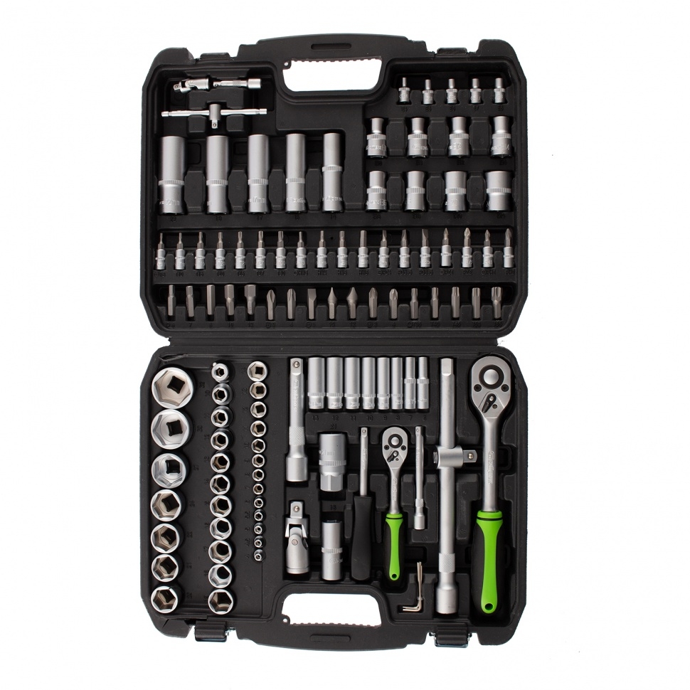 Набор инструмента Сибртех 13498, 1/2 и 1/4 дюйма, состоит из 108 предметов и предназначен для ремонта и обслуживания автомобилей, а также выполнения бытовых работ. Имеющиеся в комплекте насадки рассчитаны на крепеж с различными типами профилей и шлицев, включая HEX и TORX. Набор будет полезен профессиональным мастерам и автолюбителям. Преимущества Все элементы набора изготовлены из высокопрочной инструментальной стали и выдерживают активное использование. Матовое антикоррозийное покрытие предохраняет инструменты от ржавчины, продлевая срок их службы. Трещоточные ключи с защитным покрытием обладают повышенной износоустойчивостью. Флажковый переключатель каждого ключа позволяет мгновенно изменять направление вращения трещотки. Шаг трещоток с 45 зубцами составляет 8 градусов, что облегчает работу в ограниченном пространстве. Удлинители, карданы и удлиненные торцевые головки обеспечивают доступ к крепежам в труднодоступных местах. Набор упакован в кейс из ударопрочного пластика.