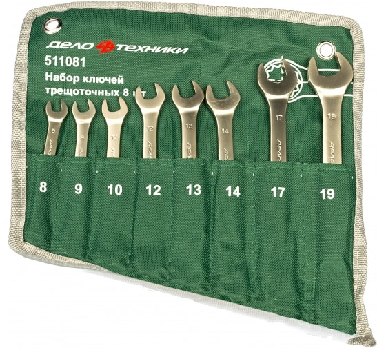 Корпус набора комбинированных ключей 8 шт сумка ДТ/20 Дело Техники 511081 выполнен из хромванадиевой стали, прочной и надежной в применении.