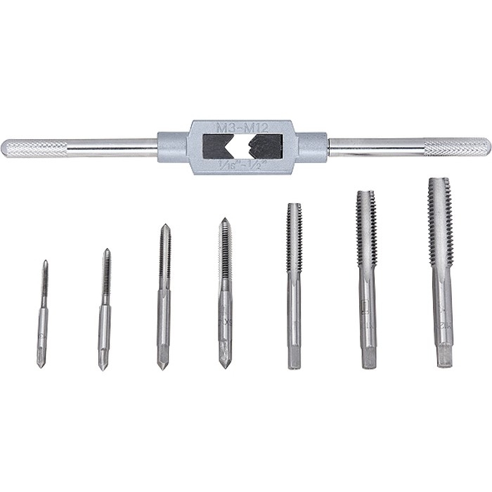 Набор метчиков М3-М12 Сибртех 77308 состоит из 8 предметов — метчикодержателя и метчиков, позволяющих вручную нарезать внутреннюю резьбу в сквозных и глухих отверстиях. Оптимален для работы с цветными металлами. Набор будет полезен при ремонте оборудования, автомобилей, а также пригодится в быту. Повышенная прочность и износостойкость — метчики изготовлены из легированной стали 9ХС.