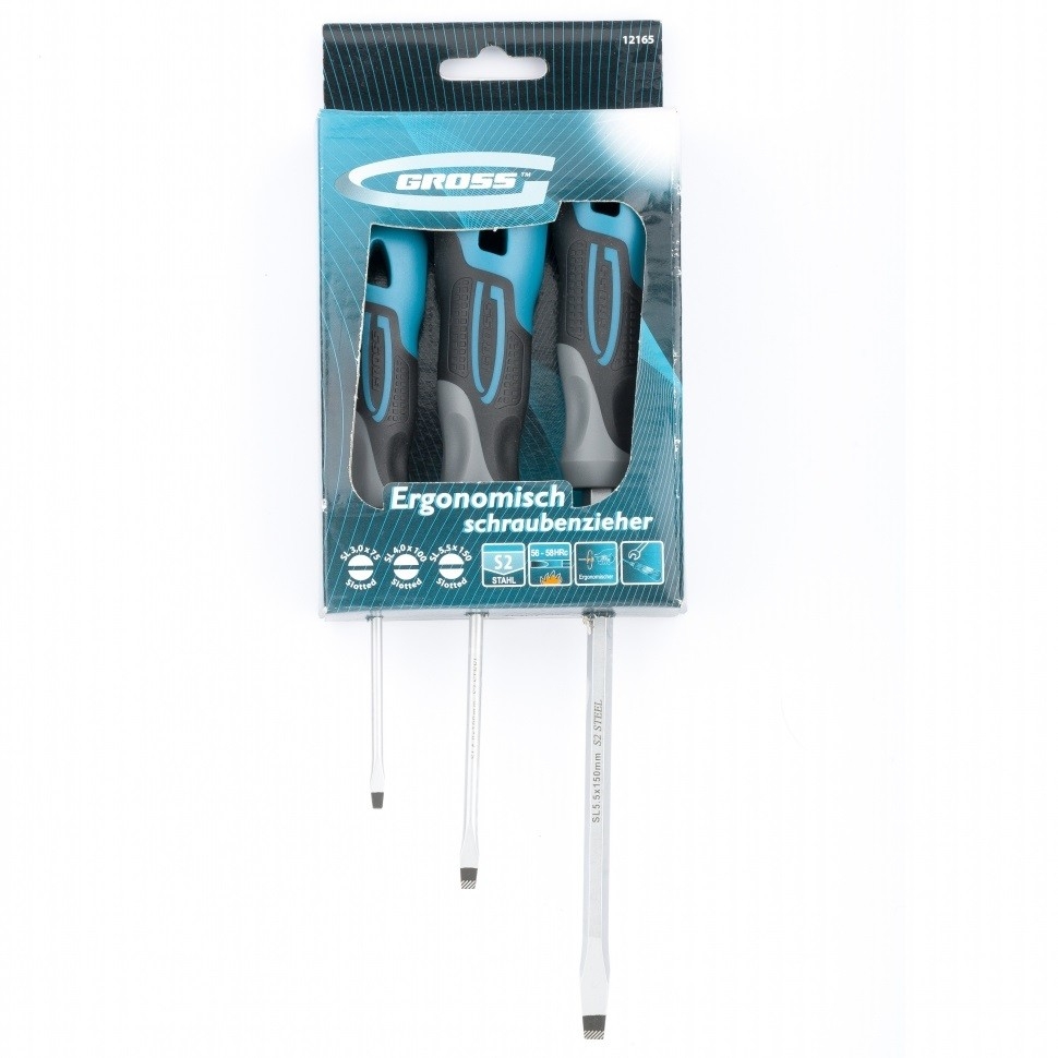 Набор отвёрток 3 шт S2 GROSS 12165 применяется для монтажных и ремонтных работ. В набор входит три стальных отвертки (SL 3,0 х 75, SL 4,0 х 100, SL 5,5 х 150), которые имеют эргономичную рукоятку, стержень с намагниченным наконечником и насечками. Имеется силовой элемент "под ключ".