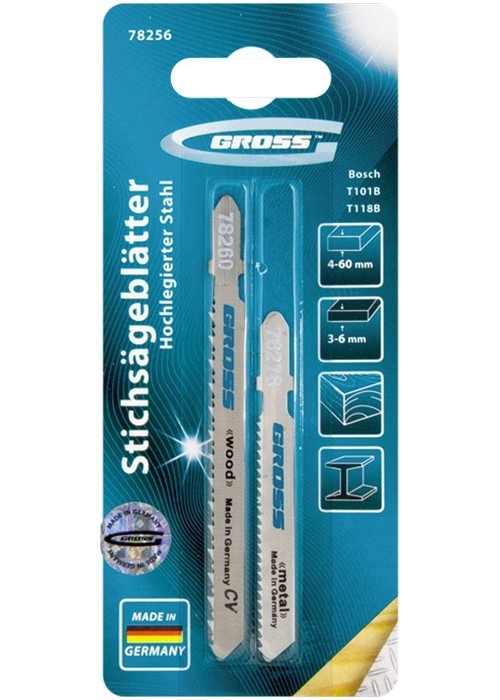 Универсальный набор полотен Gross 78256, 2 шт., предназначен для установки на электролобзики. С их помощью можно производить распил металлов толщиной 3-6 мм, а также древесины толщиной 4-60 мм. Отшлифованная под конус боковая поверхность оставляют аккуратную кромку места распила.