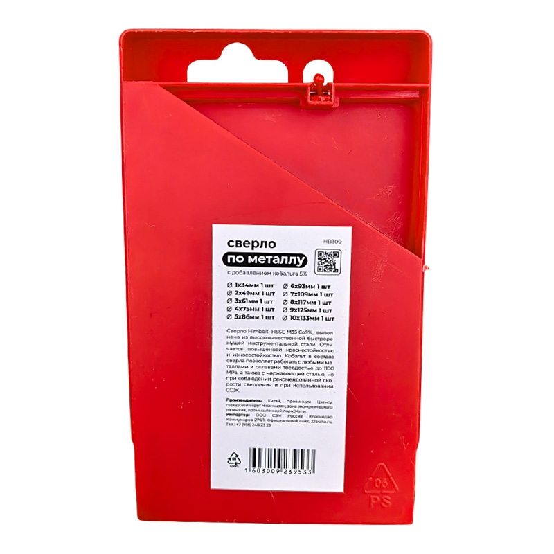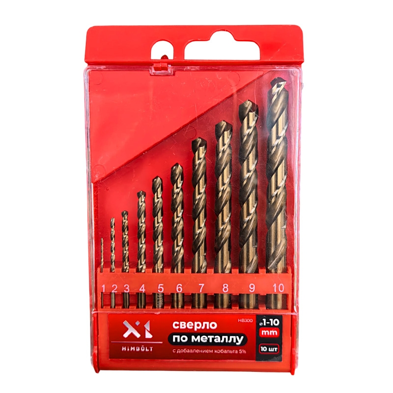 Набор сверл по металлу с кобальтом 5% P6M5K5 1-2-3-4-5-6-7-8-9-10 мм HIMBOLT 10 шт.пластиковый бокс