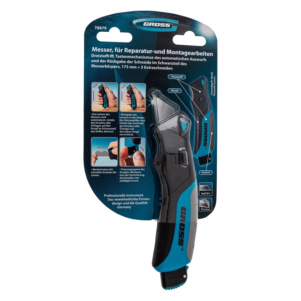 Нож рем-монтажный 175 мм. 3-хкомп.рук.кнопочный авто выброс/возврат лез.пистол.типа, 5з.л Gross