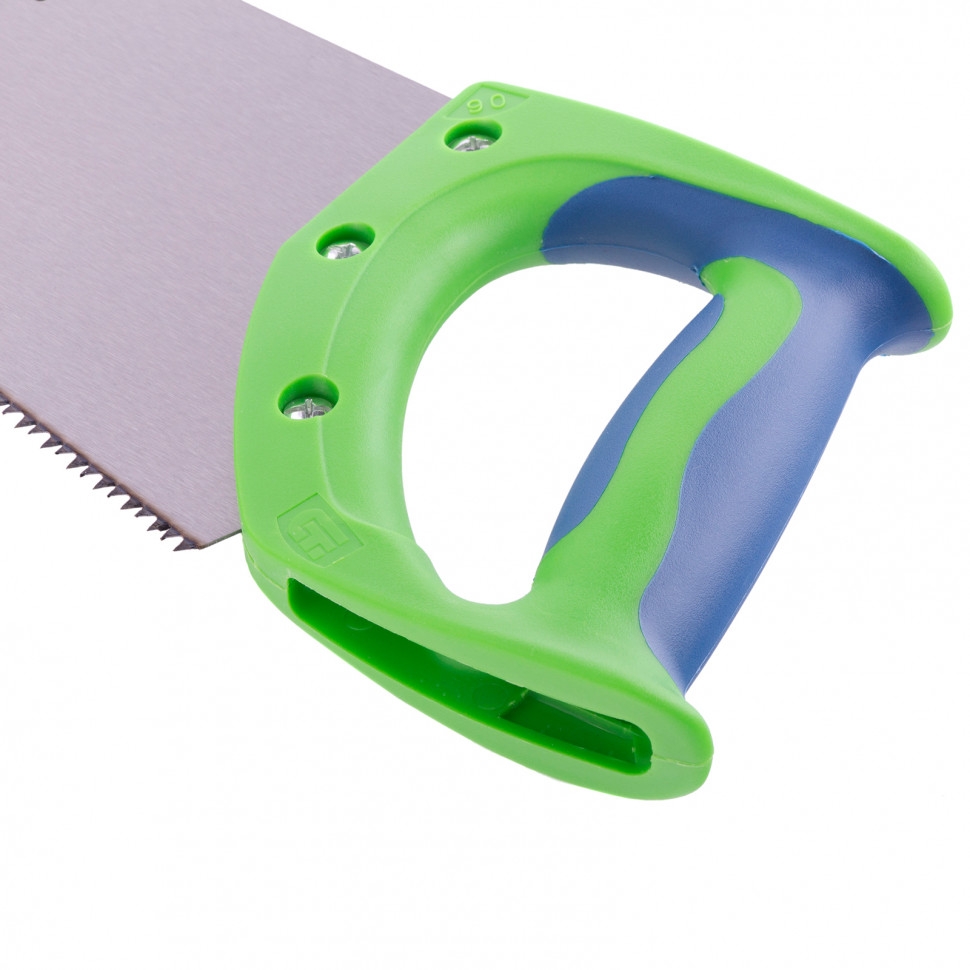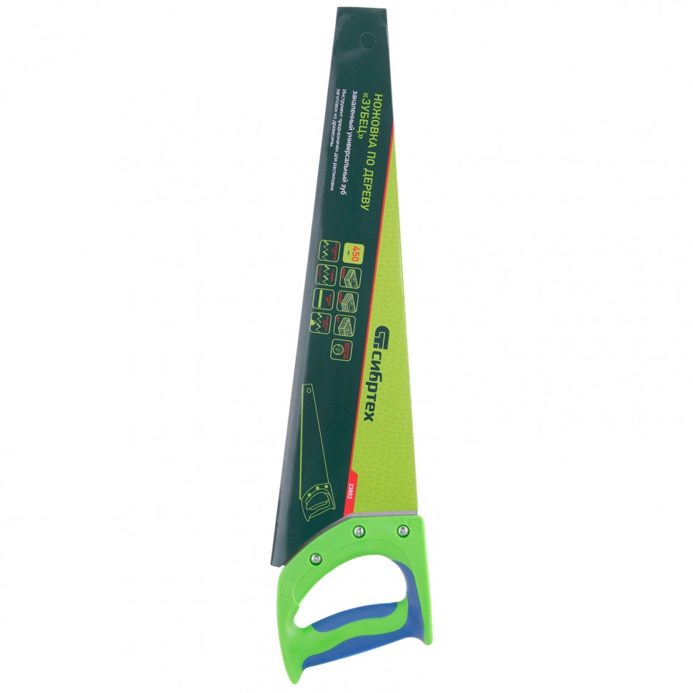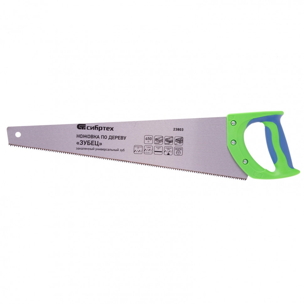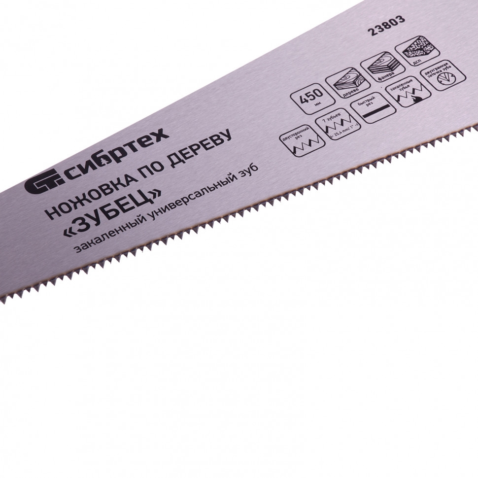 Ножовка по дереву Сибртех «Зубец» 23803 с полотном длиной 450 мм, с калеными зубьями с 2D-заточкой и шагом 7 TPI, с 2-компонентной рукояткой, используется для распиливания заготовок из древесины, фанеры и ДСП. Рабочая часть, содержащая 7 зубьев на дюйм, обеспечивает быстрый двусторонний рез. Режущую кромку можно перетачивать. Ножовка будет полезна столярам, плотникам и домашним мастерам. Преимущества Полотно изготовлено из пружинной стали 65Mn, поэтому выдерживает значительные нагрузки. Зубья прошли закалку, что обеспечивает инструменту высокий ресурс работоспособности. Поверхность полотна покрыта лаком, защищающим ее от коррозии. Рукоятка из ударопрочного пластика прикреплена к полотну 3 винтами, что придает конструкции надежность. Резиновые вставки на рукоятке препятствуют выскальзыванию ее из ладони, что повышает комфортность работы.