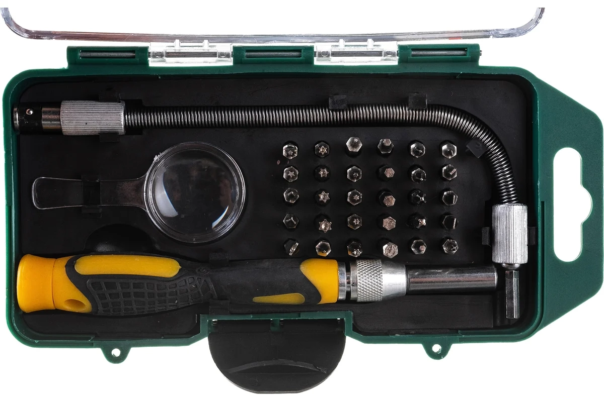 Отвертка с битами для точных работ, 30 CrV бит, гибкий переходник 190 мм, лупа, в пластик.боксе