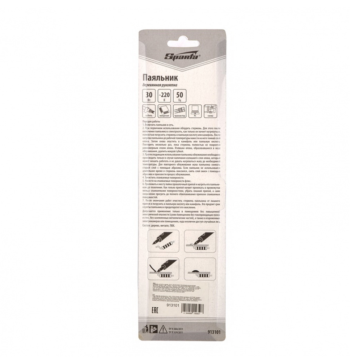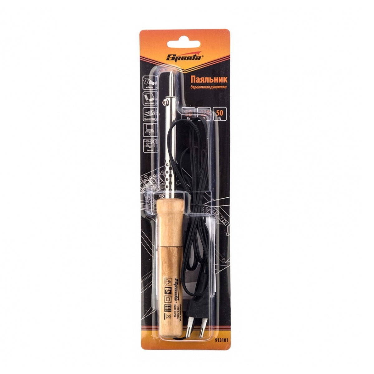 Паяльник с деревянной ручкой 30 Вт, Sparta используется для пайки электропроводки, микрочипов, электрических схем и транзисторов. Нагревательным элементом является нихромовая спираль, что уменьшает вероятность поломки прибора в результате падения или удара. Конусовидный наконечник позволяет успешно решать поставленные задачи. Жало легко очищается, а в случае выхода из строя его легко можно заменить. Защитное покрытие улучшает прилипание припоя и защищает наконечник от коррозии. Паяльник пригодится для ремонта электроники, бытовой техники, а также обслуживания автомобилей и проведения электромонтажных работ. Преимущества Медное жало быстро разогревается, поэтому прибор не требует длительной подготовки к работе. Материал рукоятки — древесина с низкой теплопроводностью, поэтому она меньше нагревается по сравнению с пластиковыми. Деревянная рукоятка удобно лежит в руке, обеспечивая комфорт при длительной работе. В комплект входит подставка для размещения на ней прибора во время работы.