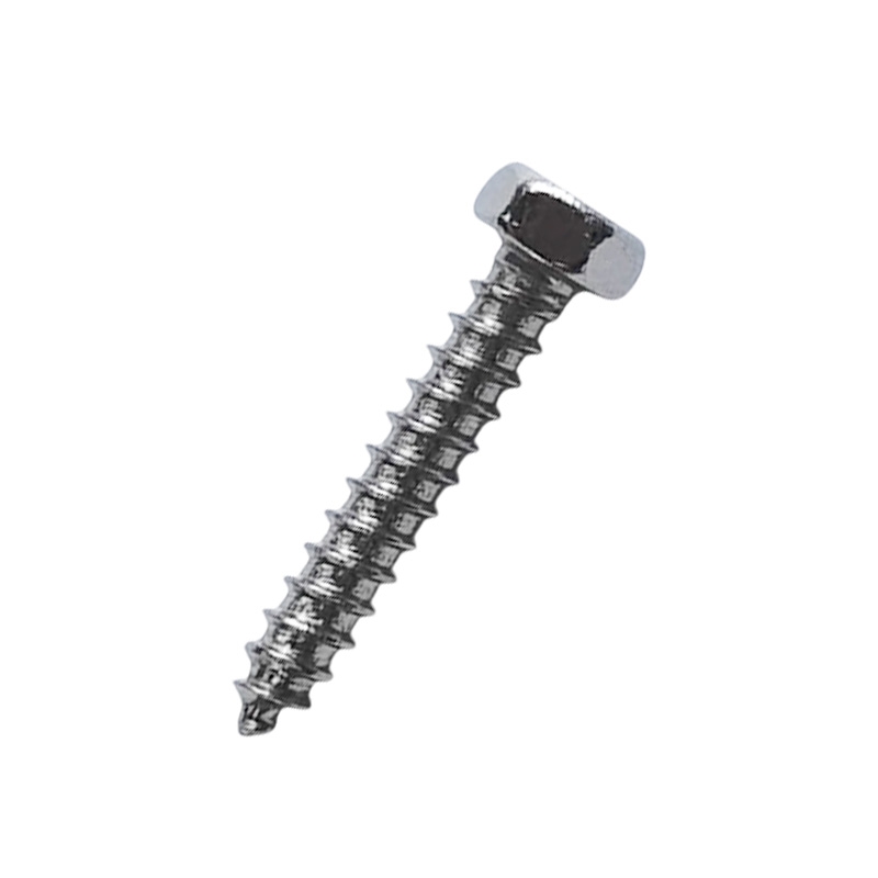 Самонарезающий винт с шестигранной головкой DIN 7976 из нержавеющей стали позиционируется как саморез для листового металла и используется для работы с мягкой сталью и алюминием. Его целесообразно использовать в тех случаях, когда требуется приложить более высокое усилие затягивания и допускается выступающая шляпка крепежа. Шуруп-саморез по металлу имеет стержень с полной мелкой резьбой, который при ввинчивании в низкоуглеродистую сталь и алюминиевые сплавы нарезает канавку в установочном отверстии без деформации собственной резьбы. Острие на конце избавляет от необходимости сверления стали толщиной до 1,0 мм. Внешний шестигранник обеспечивает увеличенный момент затяжки и исключает проскальзывание инструмента при установке. Изготовлен из немагнитной аустенитной стали А2, которая сочетает в себе высокую прочность и пластичность. Нержавеющие саморезы, выполненные из данного материала, рассчитаны на длительный срок службы без следов коррозии во влажной среде.