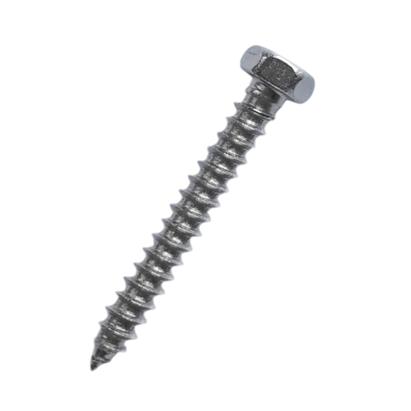 Самонарезающий винт с шестигранной головкой DIN 7976 из нержавеющей стали позиционируется как саморез для листового металла и используется для работы с мягкой сталью и алюминием. Его целесообразно использовать в тех случаях, когда требуется приложить более высокое усилие затягивания и допускается выступающая шляпка крепежа. Шуруп-саморез по металлу имеет стержень с полной мелкой резьбой, который при ввинчивании в низкоуглеродистую сталь и алюминиевые сплавы нарезает канавку в установочном отверстии без деформации собственной резьбы. Острие на конце избавляет от необходимости сверления стали толщиной до 1,0 мм. Внешний шестигранник обеспечивает увеличенный момент затяжки и исключает проскальзывание инструмента при установке. Изготовлен из немагнитной аустенитной стали А2, которая сочетает в себе высокую прочность и пластичность. Нержавеющие саморезы, выполненные из данного материала, рассчитаны на длительный срок службы без следов коррозии во влажной среде.