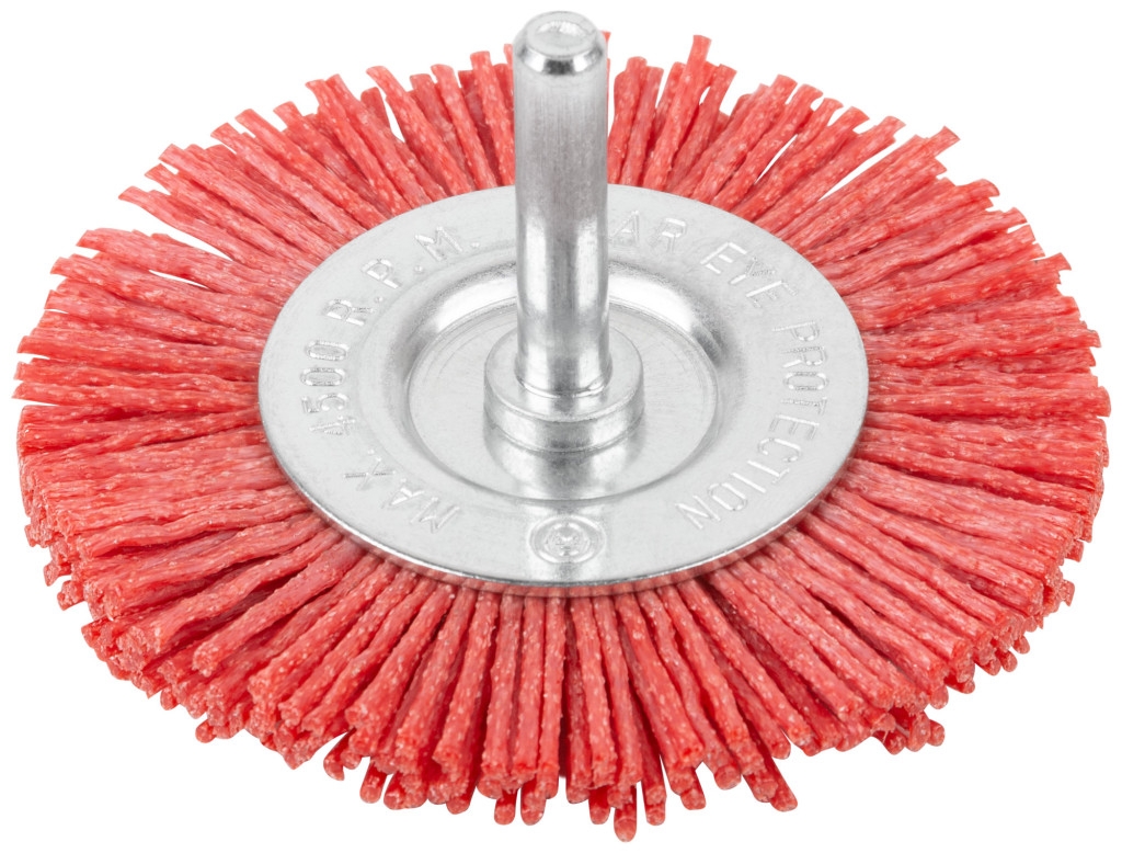 Щетка для дрели, тип «Плоская» со шпилькой, нейлоновая, зернистость Р80. Это особый тип оснастки для электроинструмента, предназначенный для работы с мягкими деликатными материалами. Применяется при зачистке и шлифовке мягких пород древесины и некоторых металлов (алюминия, меди и т. д.). Удаляет с поверхности различные загрязнения, ржавчину и заусенцы. Тип «Плоская» оптимально подходит для обработки углов, пазов, изгибов и других труднодоступных участков. Мягкая зачистка, нейлоновая.