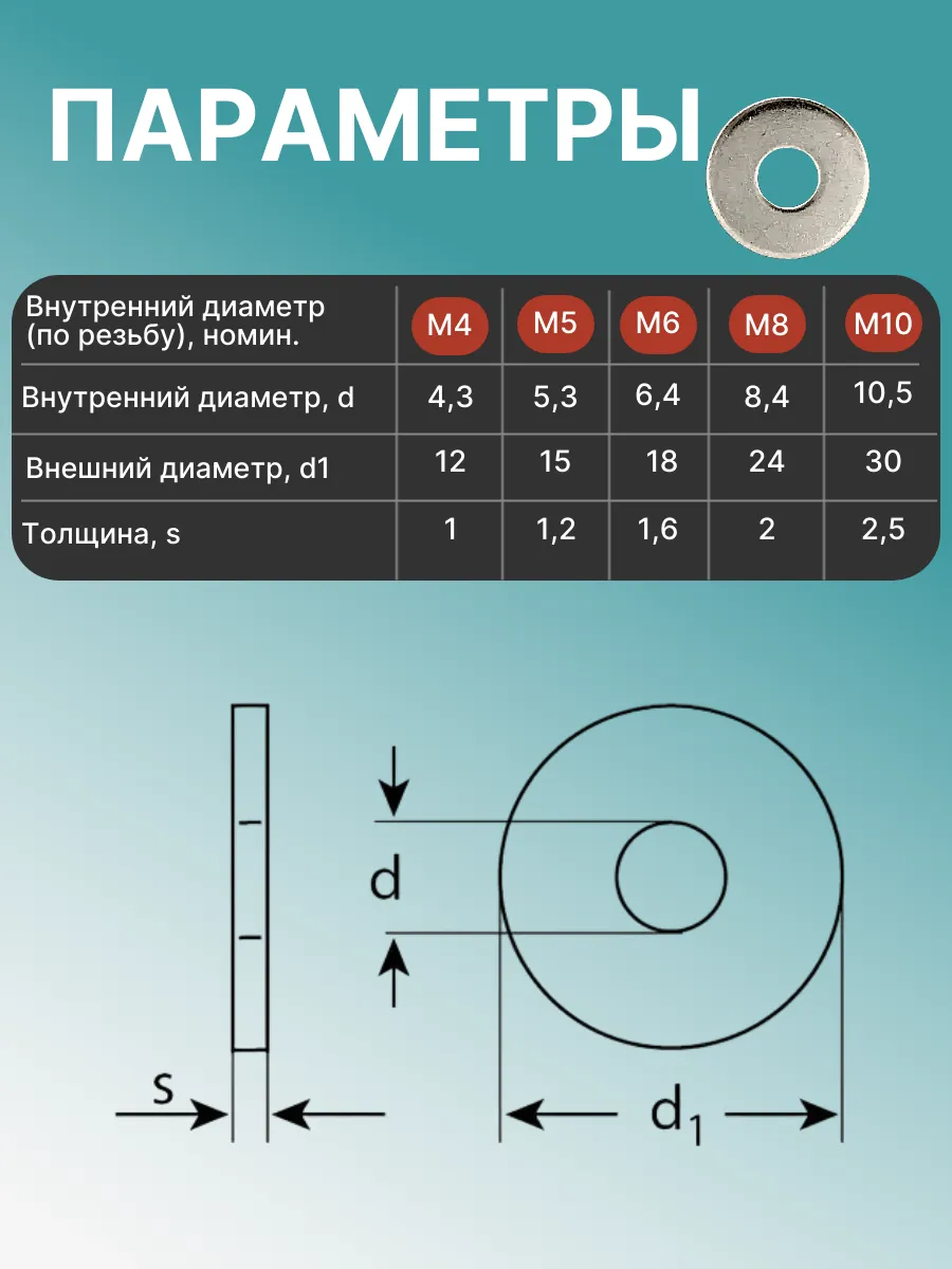 Шайба увеличенная М10 DIN 9021 нержавеющая А2 - 30 шт