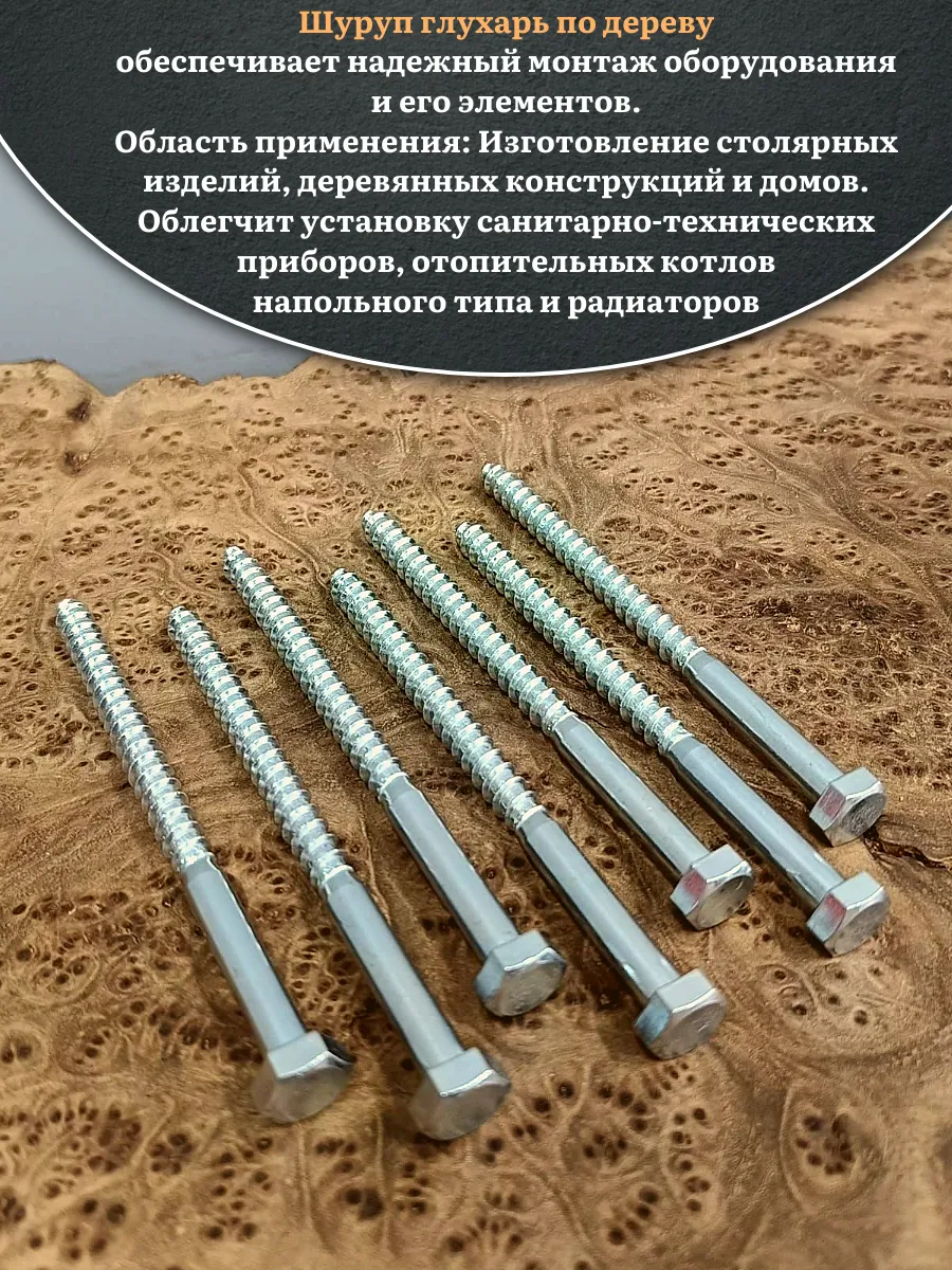 Крепёжное изделие в виде стержня с шестигранной или квадратной головкой под ключ и специальной наружной резьбой, образующей внутреннюю резьбу в отверстии соединяемого предмета. Саморез делается из оцинкованной стали. Такой крепеж обеспечивает надежный монтаж оборудования и его элементов. В состав изделия входит стержень, имеющий неполную резьбу, и шестигранная головка «под ключ». Область применения: Изготовление столярных изделий, деревянных конструкций и домов, установку санитарно-технических приборов, отопительных котлов напольного типа и радиаторов облегчит саморез типа «глухарь», соответствующий DIN 571. Чтобы смонтировать крепеж в строительную конструкцию из кирпича, природного камня или бетона, саморез нужно дополнительно укомплектовать разжимной втулкой из полимерного материала с соответствующими размерами. Изделие можно устанавливать в горизонтальных или вертикальных поверхностях.