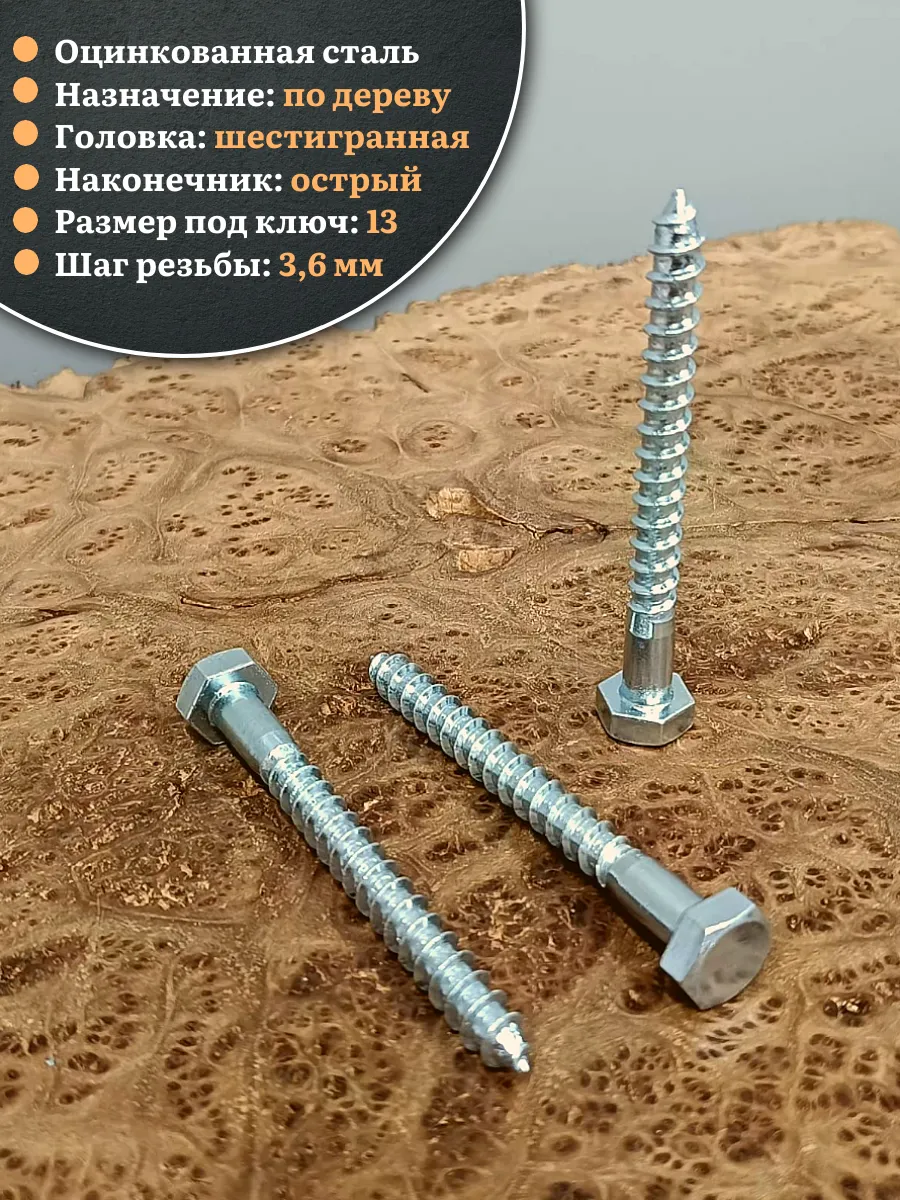 Крепёжное изделие в виде стержня с шестигранной или квадратной головкой под ключ и специальной наружной резьбой, образующей внутреннюю резьбу в отверстии соединяемого предмета. Саморез делается из оцинкованной стали. Такой крепеж обеспечивает надежный монтаж оборудования и его элементов. В состав изделия входит стержень, имеющий неполную резьбу, и шестигранная головка «под ключ». Область применения: Изготовление столярных изделий, деревянных конструкций и домов, установку санитарно-технических приборов, отопительных котлов напольного типа и радиаторов облегчит саморез типа «глухарь», соответствующий DIN 571. Чтобы смонтировать крепеж в строительную конструкцию из кирпича, природного камня или бетона, саморез нужно дополнительно укомплектовать разжимной втулкой из полимерного материала с соответствующими размерами. Изделие можно устанавливать в горизонтальных или вертикальных поверхностях.