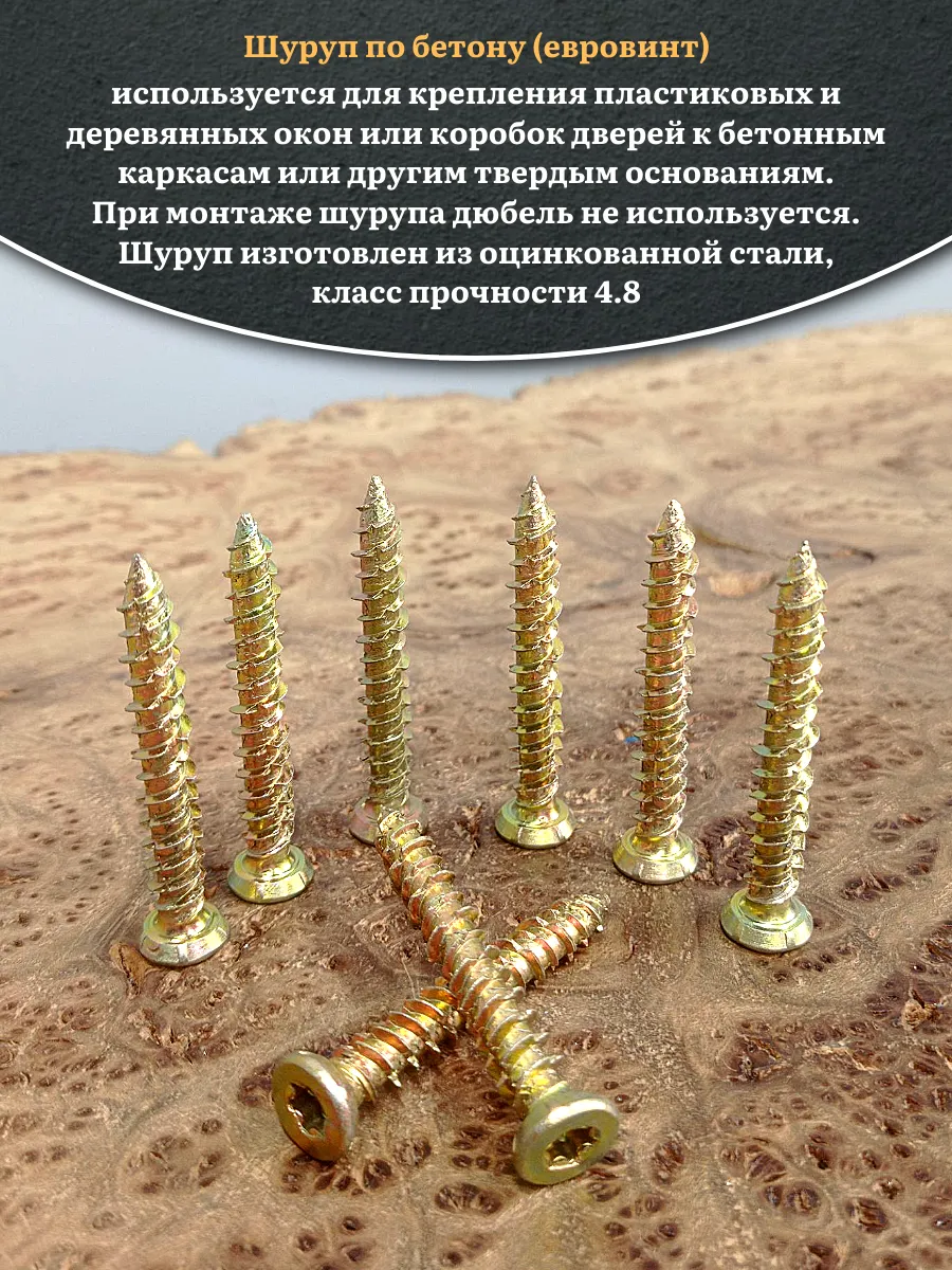 Шуруп — это металлический крепеж, представляющий собой стержень с головкой и острым наконечником. Универсальность проявляется в конструкции и области применения. Назначение шурупа — стягивать, скреплять между собой элементы: деревянных, древесностружечных и гипсокартонных плит, из тонкого листового металла. Саморез-шуруп "Бетон Нагель" с потайной головкой, с насечками и шлицем TORX. Шуруп широко используется в строительстве и при проведении ремонтно-отделочных работ. Часто применяются для крепления оконных рам и дверных коробок. Данный саморез изготавливается из стали и потом покрывается желтым цинком. По всей длине стержня расположена острая попеременная резьба. Шуруп имеет острый наконечник и потайную шляпку. Для работы с данной моделью шурупа необходима бита TORX. Материал основания: бетон, природный камень, кирпич.