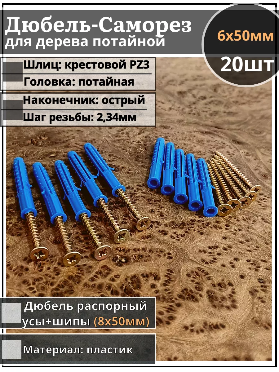 Шуруп саморез 6х50 мм ЖЦ с дюбелем 8х50, 20 шт.